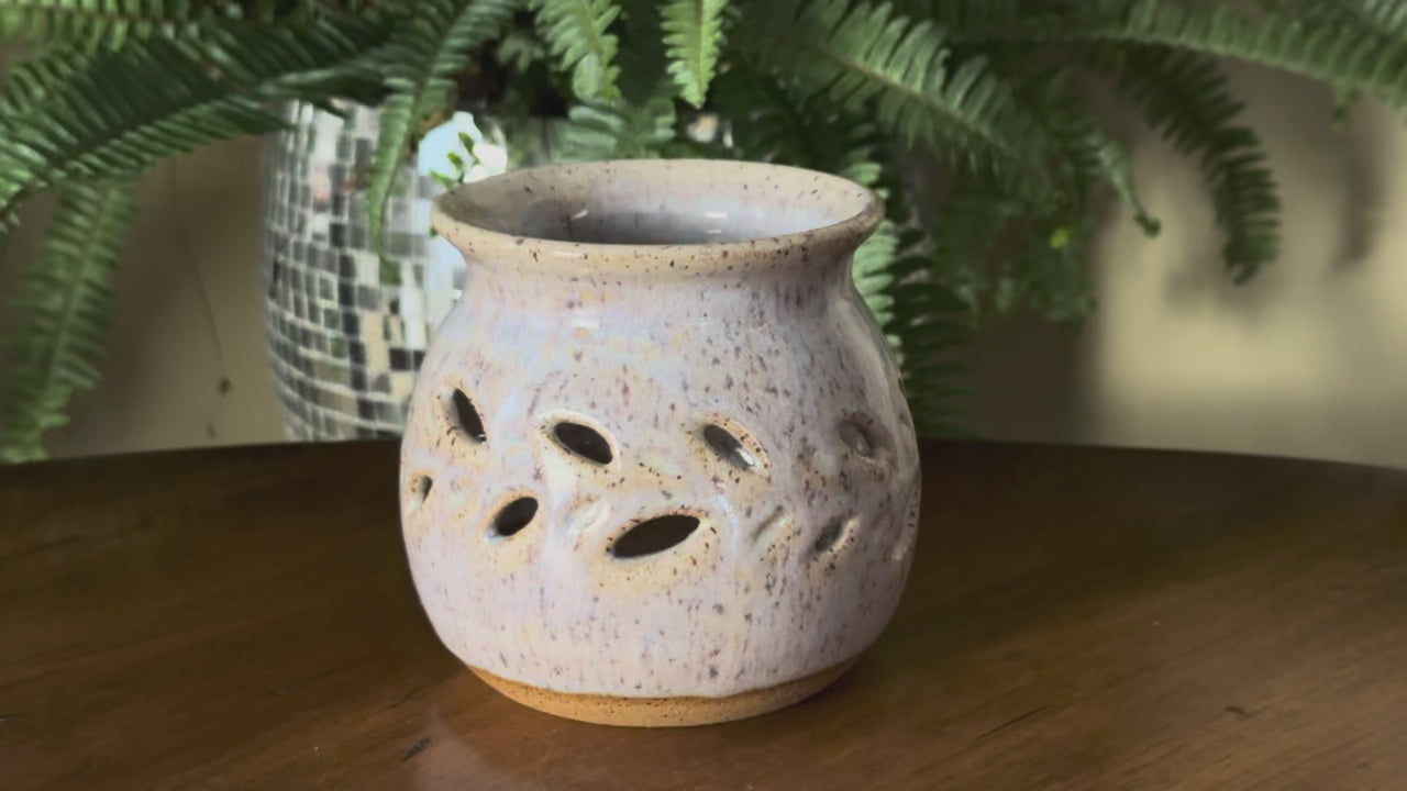 Glazed in White and Coastal Blue, this luminary features carved openings that catch the light beautifully.